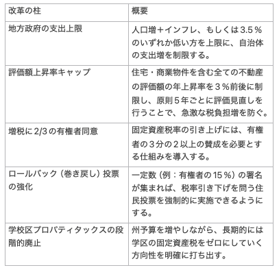 このプランは、住宅オーナーだけでなく、賃貸住宅の入居者やビジネスオーナーにとっても中長期的な負担の安定化につながる一方で、市や郡、学区など地方政府の財源確保やサービス維持に大きな制約を与えるため、議会や自治体側からの反発も予想されています。