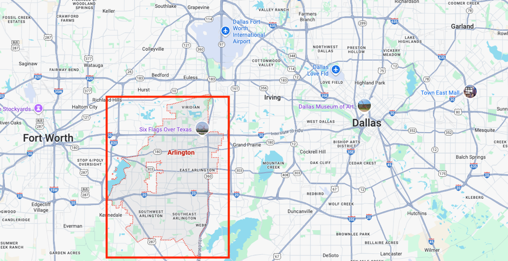 アーリントンはI-30/I-20高速道路沿いで、北にDFW空港、東西にダラス・フォートワース市街を結びます。