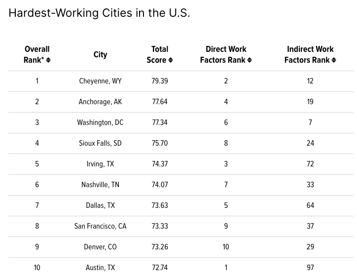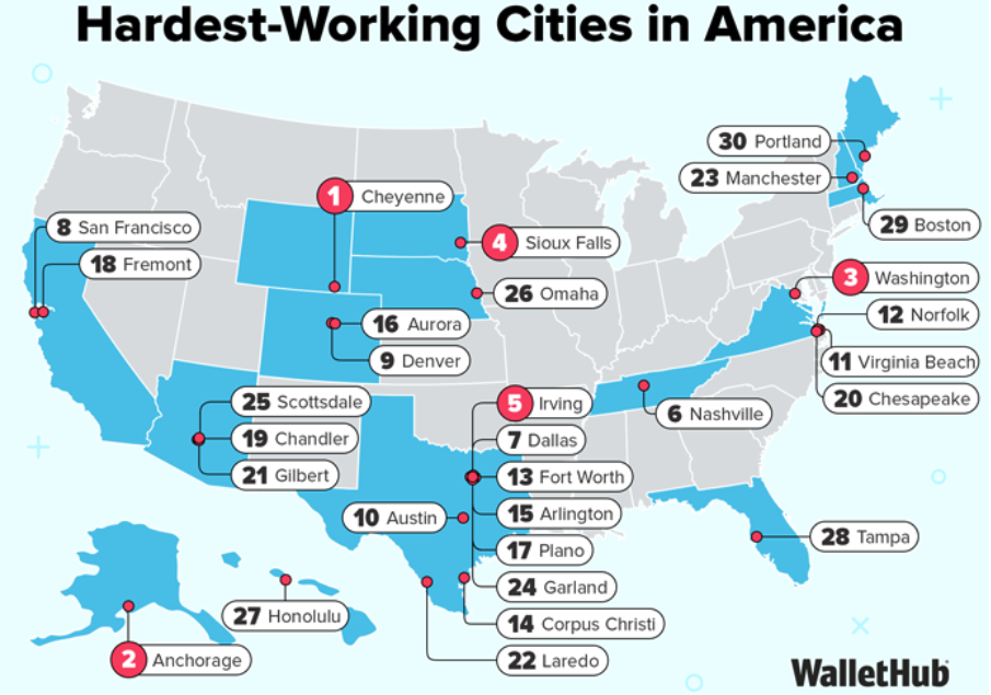 同ランキングでは、テキサス州からアービング、ダラス、オースティンなど複数都市が上位入りしており、州全体としてワークエシック(仕事への姿勢)の強さがうかがえます。