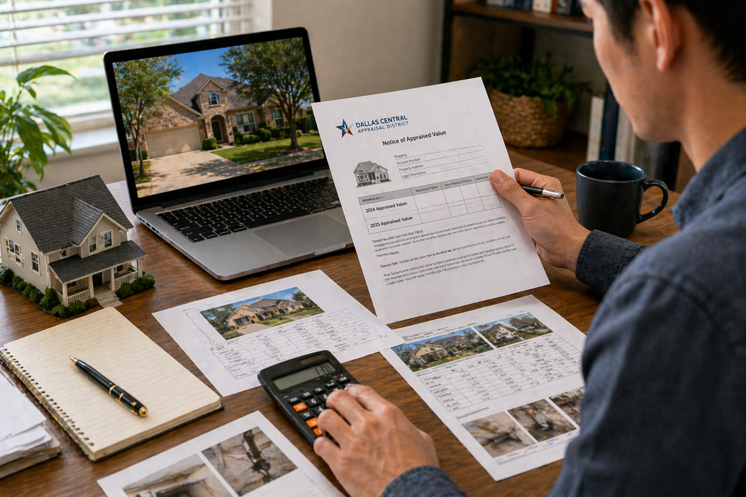Dallas Central Appraisal District(DCAD)では、所有者名・住所・アカウント番号で物件を検索し、Notice of Appraised Value を基準に評価額を確認します。2025年の公開値を踏まえると、新築・購入直後の物件ほど、購入価格と評価額の差が争点になりやすいです。